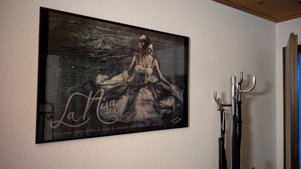 An der Wand über meiner BDSM Kommode mit dem „Spielzeug“ und meiner Fetischbekleidung hängt ein Bild meiner ersten Tätowiererin „La Nisa“ aus der Nähe von Koblenz (DE). Handsigniert. Hätte ich damals 2013-2014 gedacht, dass das so gut zu meiner noch nicht vorhandenen BDSM Leidenschaft passen würde? Sicher nicht.